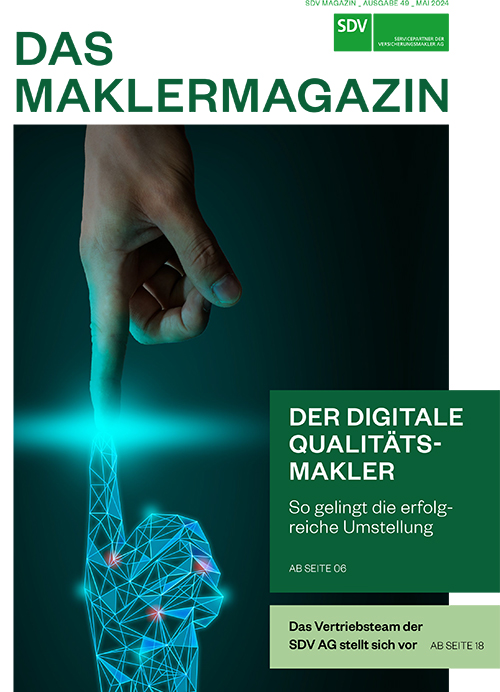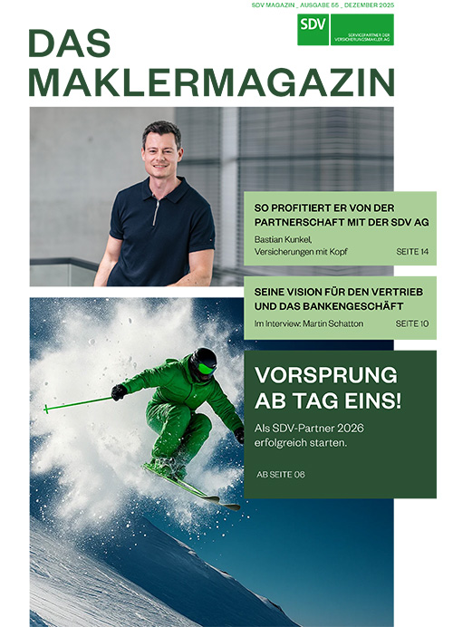 202520242023202220212020201920182017201620152014201320122025Ausgabe 55 Dezember 2025 Vorsprung ab Tag Eins – Als SDV Partner 2026 erfolgreich starten. Ausgabe 54 September 2025 So setzt sich die SDV AG für die Unabhängigkeit von Maklern ein Ausgabe 53 Juni 2025 Die SDV AG als Benchmark am Poolmarkt Ausgabe 52 Januar 2025 Bewegung in der Branche! Darum ist die SDV AG ein starker Partner 2024Ausgabe 51 Dezember 2024 Frohe Weihnachten und ein gesundes Neues Jahr! Ausgabe 50 September 2024 Die SDV AG – 15 Jahre Erfolgsgeschichte Ausgabe 49 Mai 2024 Der digitale Qualitätsmakler – So gelingt die erfolgreiche Umstellung Ausgabe 48 Februar 2024 Onboarding bei der SDV / myInsure 2.0 – die Zukunft der Maklerverwaltung 2023Ausgabe 47 Oktober 2023 KI-Revolution – Wie Künstliche Intelligenz die Versicherungsbranche umkrempelt Ausgabe 46 August 2023 Erfolgsstory der SDV AG – Ein Blick auf herausragende Services und Leistungen Ausgabe 45 Mai 2023 LV-Aktion 2023 Lichtblicke schenken / Trendthema bKV Gesundheit als Benefit bei der Mitarbeitersuche Ausgabe 44 Februar 2023 Seriosität und Sicherheit in anspruchsvollen Zeiten 2022Ausgabe 43 Oktober 2022 Erfolgreich mit der SDV AG Ausgabe 42 Juli 2022 Die große SDV Gewerbeaktion 2022 Ausgabe 41 April 2022 Beste Konditionen, optimierte Prozesse und ein Beitrag für die Umwelt Ausgabe 40 Februar 2022 Die erste Wahl für Qualitätsmakler 2021Ausgabe 39 Oktober 2021 Jahresendspurt bei der SDV AG Ausgabe 38 Juli 2021 Achtung Cyber-Attacke! Ausgabe 37 April 2021 Digitale (Weiter-) Bildungsinitiative Ausgabe 36 Januar 2021 SDV AG – Persönlich, zukunftsorientiert, innovativ 2020Ausgabe 35 Oktober 2020 myInsure – Neue SDV Plattform für digitale Services Ausgabe 34 Juli 2020 Digitalisierung – Beratung in Zeiten von Corona Ausgabe 33 April 2020 SDV AG – Maklerpool Services Ausgabe 32 Januar 2020 SDV AG – Servicedienstleistungen 2019Ausgabe 31 September 2019 SDV AG – ein Rückblick über 10 Jahre Servicequalität Ausgabe 30 Juli 2019 Ruhestandsplanung und Generationsberatung – Welche Potenziale diese Beratungssegmente bieten Ausgabe 29 April 2019 Gesundheit und Prävention – Was Versicherer für Ihre Kunden tun können. Ausgabe 28 Januar 2019 Künstliche Intelligenz – Wie das maschinelle Lernen die Versicherungswirtschaft verändert. 2018Ausgabe 27 Oktober 2018 Vergütungsmodelle – Honorar- und Provisionsberatung vs. duale Vergütung Ausgabe 26 Juli 2018 „Akquise – so erweitern Sie Ihren Kundenstamm“ Ausgabe 25 April 2018 „Rechtssicher beraten – So vermeiden Sie Stolperfallen.“ Ausgabe 24 Januar 2018 „Versicherungstrends – Wohin wird sich der Versicherungsmarkt entwickeln?“ 2017Ausgabe 23 Oktober 2017 “Chancen – Digitales Maklerbüro” Ausgabe 22 Juli 2017 “Volltreffer – Rückblick auf die Topthemen des 3. Augsburger Maklerkongresses 2017 und die Highlights der SDV Experten Tour” Ausgabe 21 April 2017 “Der Vertrieb der Zukunft – Unsere neue Makler-App und die App myInsure für den Kunden” Ausgabe 20 Januar 2017 „Digitalisierung? Hybride Beratung? FinTechs? Chancen nutzen – Lösungen finden“ 2016 Ausgabe 19 Oktober 2016 „LV Sale 2016“ Ausgabe 18 Juli 2016 „Rückblick: Augsburger Maklerkongress & Expertentour 2016 Ausgabe 17 April 2016 „Die betriebliche Altersversorgung (bAV)“ Ausgabe 16 Januar 2016 „Neues aus dem Bereich der Lebensversicherung“ 2015 Ausgabe 15 Oktober 2015 “Jahresendgeschäft: Türöffner Kfz-Versicherung” Ausgabe 14 Juli 2015 “Kauf, Verkauf und Verrentung von Maklerbeständen” Ausgabe 13 April 2015 “Quo Vadis, Lebensversicherung” Ausgabe 12 Januar 2015 “SDV AG: Service +” 2014 Ausgabe 11 Oktober 2014 „Bestand und Eigentum + Sonderthema LVRG“ SONDERAUSGABE September 2014 „Kauf und Verkauf von Maklerbeständen“ Ausgabe 10 Juli 2014 „Bausparen – welcher Bausparer für wen?“ Ausgabe 9 April 2014 „Altersversorgung im Niedrigzinsumfeld“ Ausgabe 8 Januar 2014 „Interview Ulrich Leitermann, Vorstandsvorsitzender SIGNAL IDUNA“ 2013 Ausgabe 7 Oktober 2013 „Anspruchsvoller Zukunftsmarkt – Die betriebliche Krankenversicherung (bKV)“ Ausgabe 6 Juli 2013 „Manufaktur Augsburg GmbH – Versicherungslösungen wie von Hand gemacht“ Ausgabe 5 April 2013 „Pflege-Bahr -Staatliche Förderung der Pflegezusatzversicherung“ Ausgabe 4 Januar 2013 „Gewerbeversicherung – Sicher auf unsicherem Terrain.“ 2012 Ausgabe 3 Oktober 2012 „Unisex – Das Thema 2012“ Ausgabe 2 Juli 2012 „Pflege – Herausforderung der Zukunft“ Ausgabe 1 April 2012 „Im Interview: Reinhold Schulte, Vorstandsvorsitzender SIGNAL IDUNA“