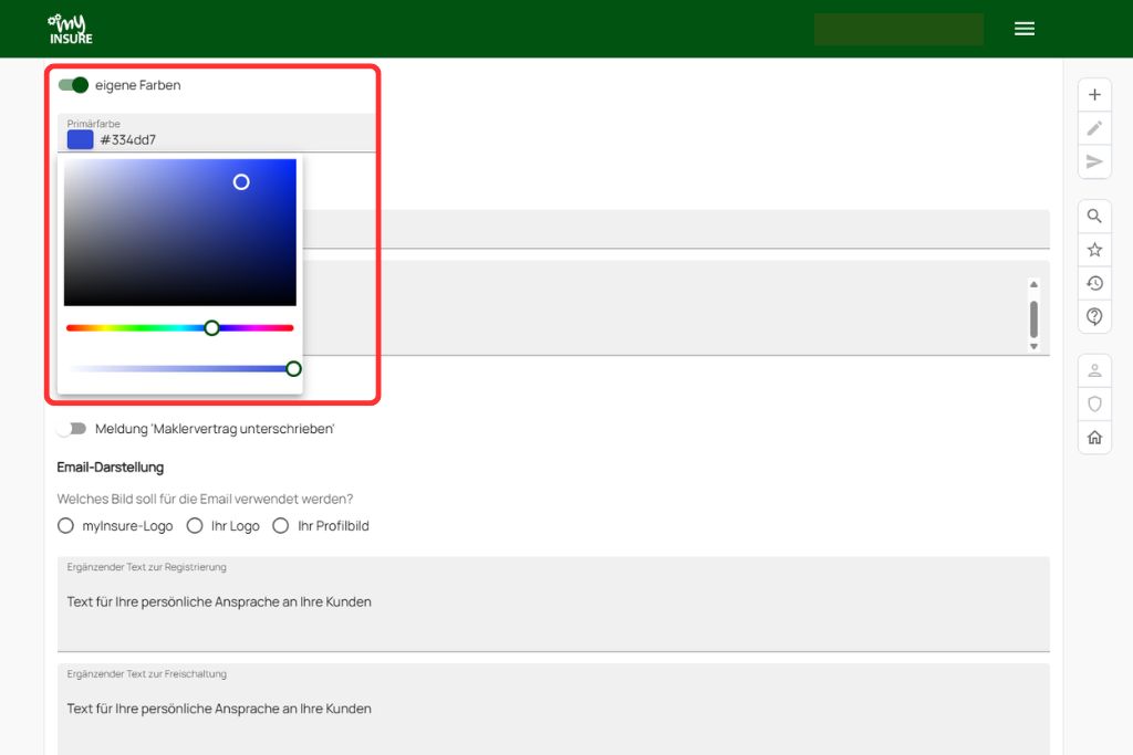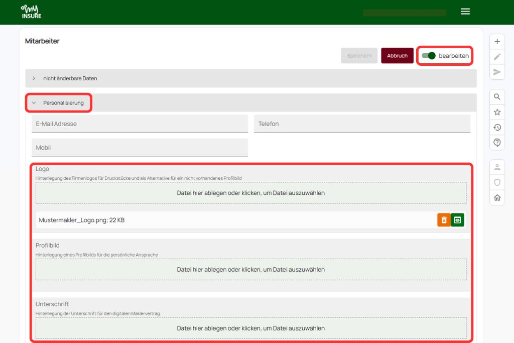 Lade im Bereich „Personalisierung“ Dein Logo, optional ein Profilbild sowie Deine Unterschrift für den digitalen Maklervertrag hoch.