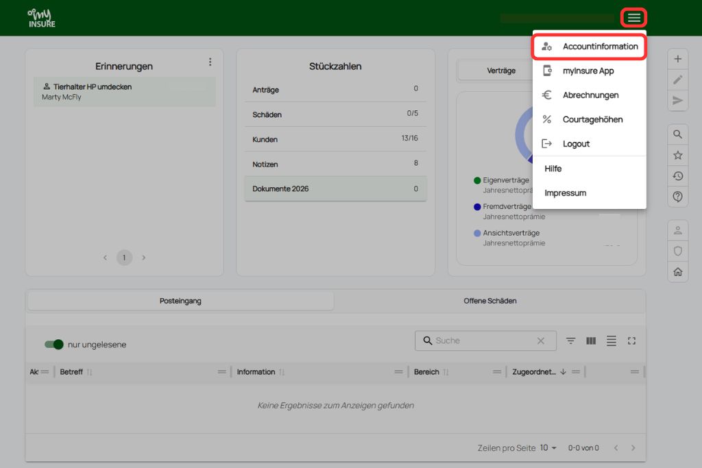 Klicke im Menü oben rechts auf „myInsure App“.